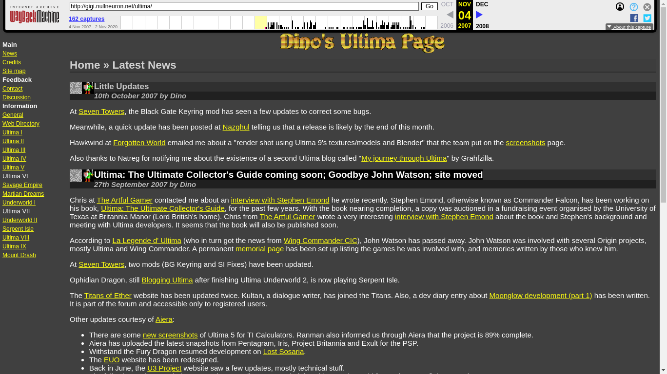 The evolution of Dino's Ultima Page through its first year is documented not only in its news archives, but also in two dedicated articles. "The First Move" and "The First Anniversary" describe the progress made after six months and one year, respectively. It's unfortunate that I did not keep up the tradition of writing these summaries.