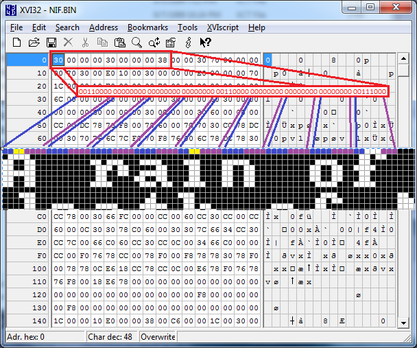 The file format of NIF.BIN can be understood by taking a look at the first few bytes in a hex editor. The first 2 bytes are 30 hex, which are 00110000 in binary. As you can observe from the image above, this already maps directly to the first few pixels of the image, where the 1s correspond to the top of the 'A' character that starts off the endgame text. The next 1s are encountered at the dot of the 'i' character.
