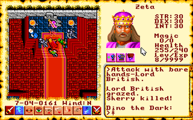 If you lose a party member with their inventory or portrait open, under certain circumstances, s/he gets replaced by a character called "Zeta", with Lord British's portrait, statistics and inventory. You can use this trick to steal Lord British's equipment.