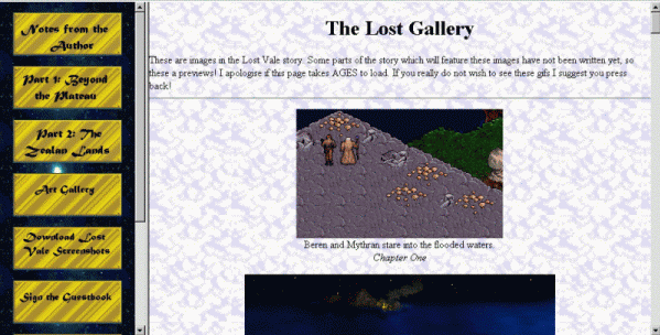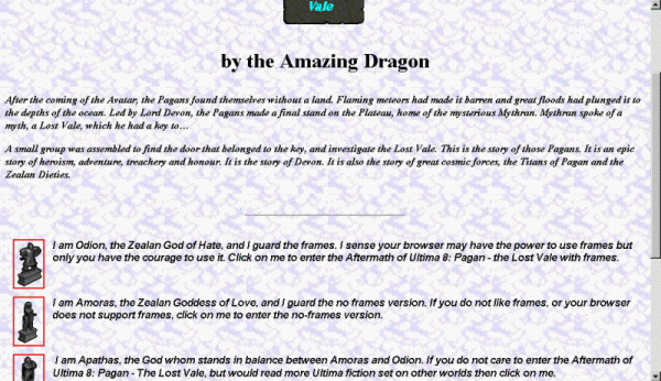The Lost Vale is a fanfiction written by Amazing Dragon to give life to the add-on of Ultima 8 that was never released. Unfortunately, the files were lost on his host, but thanks to Natreg Dragon I was able to recover them and put them back online. It is a known fact that Dino's Ultima Page itself started as a simple host for this fanfiction. Nowadays, it is also hosted at the Dragon Press.