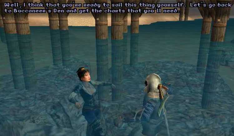 Before heading for Wrong I used the Moongate to go to Minoc. Raven was there on her ship but she wouldn't take me back to Britain because I didn't have the Blue Lens at the time. So I Moongated to Britain but I guess she stayed at Minoc. Later the game whisked her to Wrong for the prison cell scene. After "clearing our names" I got a big surprise at the Britain docks.