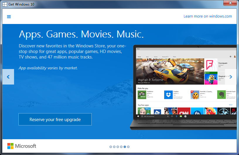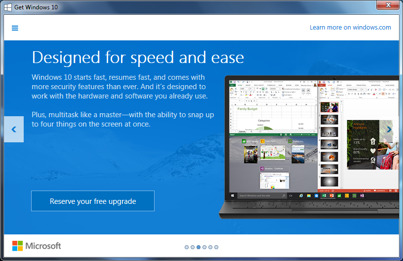 When you click on the system tray icon, a small application gives you an overview of what’s coming in Windows 10, and allows you to reserve the upgrade. Below are screenshots of this application (from 3 weeks ago), included here as a historical record. The application is slightly different today, but more or less conveys the same message.