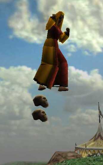 I thought she'd look better with a couple of skulls on top of her head. Later in the game I found that she had the same "climbing disease" as the merchants who like walking around on top of their counters.